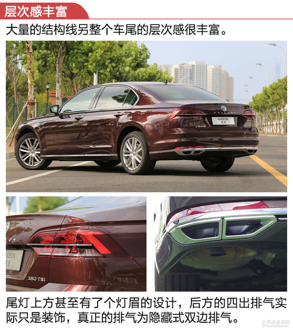 在外型上,380TSI御尊版做为新手入门车系并沒有和顶配版有太过显著差别,LED车大灯和LED后尾灯的配置确保了全车外型的现代感,18寸轮毂规格和顶配保持一致,后排座隐私玻璃让后排座旅客隐秘性更为,可以说这款新手入门配备在外型上基础考虑了辉昂做为一台旗舰级行政部门小汽车的“情面”要求。
