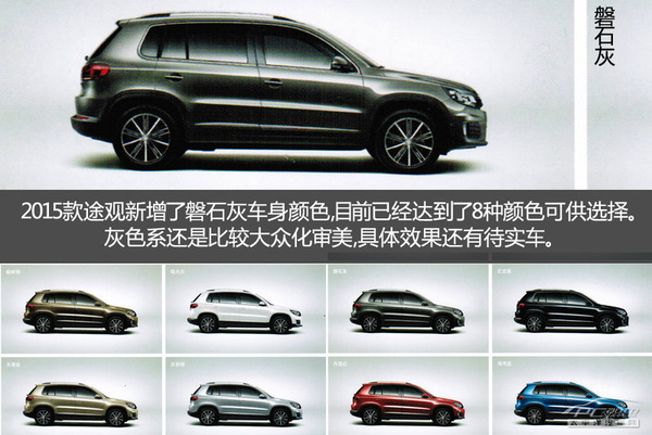 上边说过2015款大众途观的不会改变之处,下边讨论一下新款车型有哪些关键转变。最先在外型颜色挑选层面,2015款大众途观除开持续原来七种车系色调外,还增加磐石深灰色,为人性化顾客出示了大量之选。