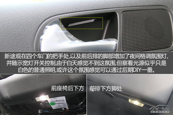 2015款大众途观以内饰上的更改非常少,全新升级的LED迎宾礼仪梯步饰条、侧门开扳子车内氛围灯和足部室内空间车内氛围灯,大量的是为顾客产生了个性心情,但是照明灯具在晚间還是有一定的实际意义。