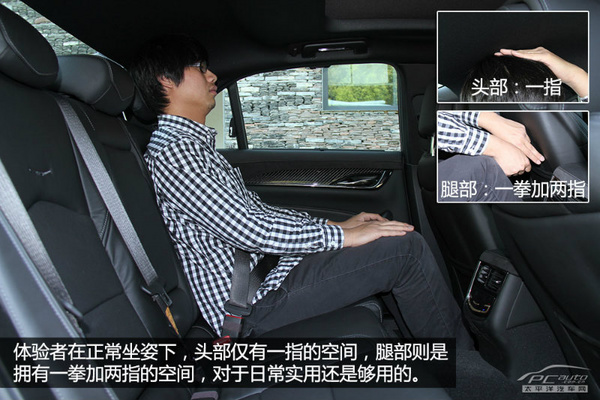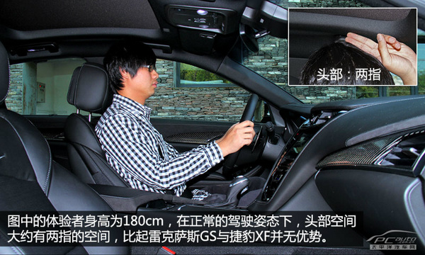 图上的感受者个子为180cm,在一切正常的安全驾驶姿势下,头顶部室内空间大概有两指的室内空间,相比凌志雷克萨斯GS与捷豹XF而言,并没什么优点,但相比奥迪A5而言倒是水准非常,针对平时好用而言,也还算作足够了。
