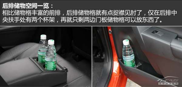 置物室内空间还算得上是丰富多彩,平时开车可以说基础足够,但令人难以相信的是前后排的多元化很大,若是后排座挤满三人爆满时正中间这位好像两个放饮料瓶的部位也找不着,这难免有点儿过度有头无尾了。