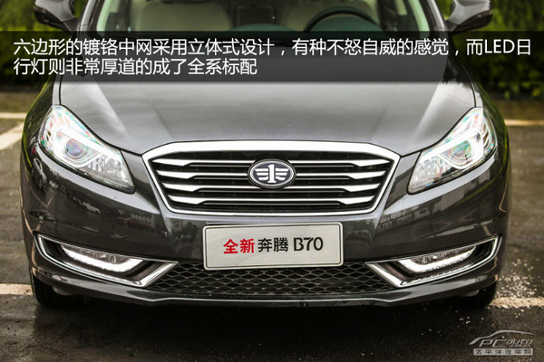 全新升级奔腾B70的进气格栅选用了奔流全新的家族化六边形进气口设计方案,总体造型设计和刚发售没多久的奔腾B90十分类似,而平台式的进风口不锈钢装饰条则让全部前脸看起来更为精神实质和空气。