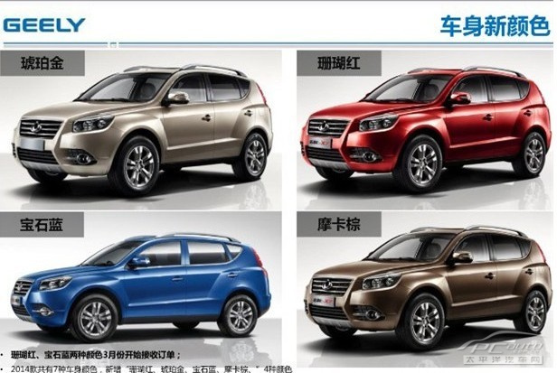 此外,2014款吉利GX7在旧款的基本上提升了珊瑚色、琥珀金、宝石蓝和摩卡棕这四种色调。