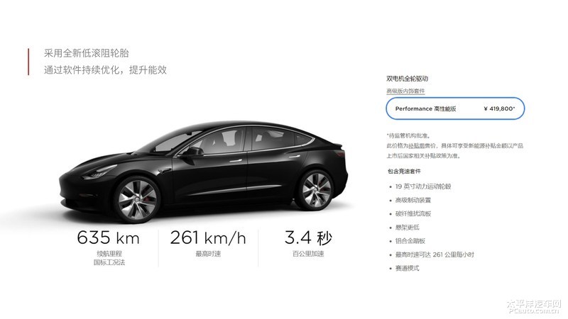 这周T-Talk交流会的此外一个一部分是有关特斯拉国产Model 3 Performance性能卓越版续航力的宣布校准,NEDC续航力做到635km。从官方网材料看来,低滚阻的车胎挑选及其手机软件上针对全车能耗等级的不断提升是国内Model 3 Performance性能卓越版续航力提升的主要元勋。