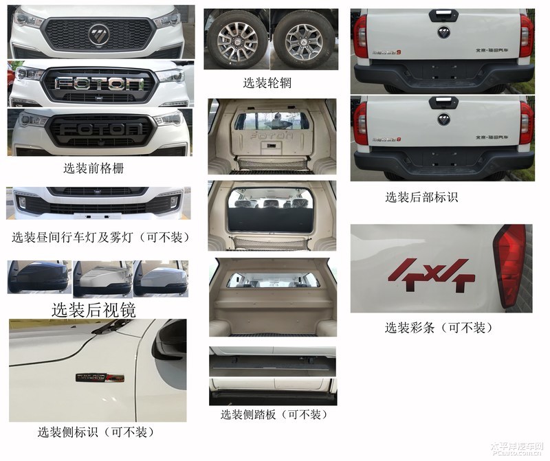 新汽车持续了拓陆者的造型设计设计风格,设计方案简易粗犷。前脸含有“FOTON”字眼的灰黑色尺寸较大进气格栅气魄十足,相互配合含有横穿式格珊的前包围着,构成一副粗狂霸气侧漏的样子。依据申报信息,此车进气格栅、知名品牌LOGO、外倒车镜、前包围着和轮圈都是有多种多样款式可选。车体规格层面,新汽车的尺寸各自为5340/1940/2070(2080)mm,轮距为3110毫米。
