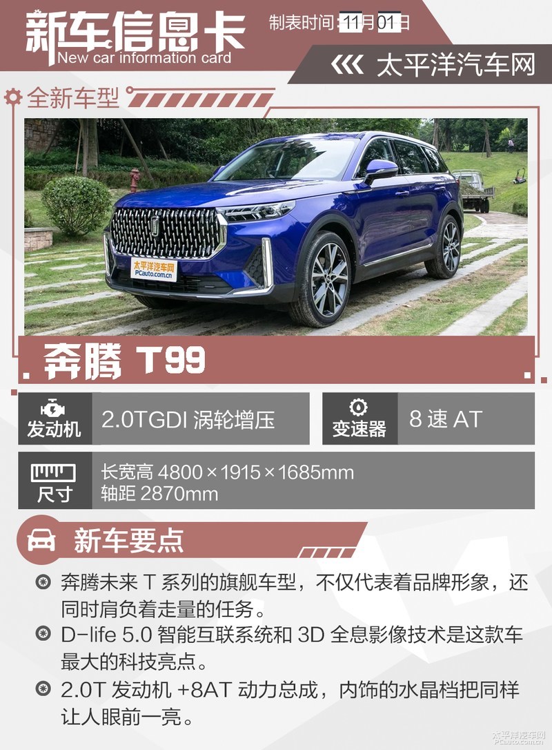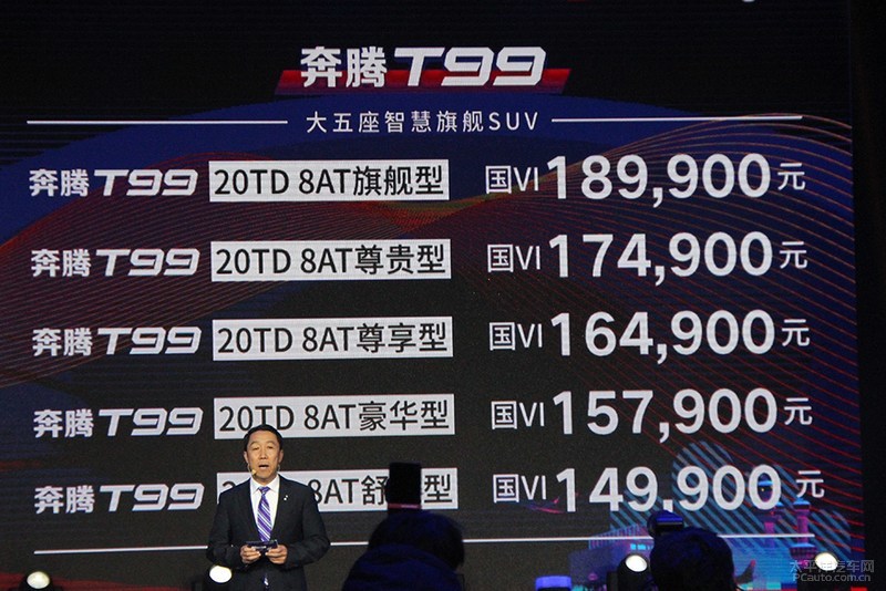【尊流汽车网 新汽车频道栏目】一汽奔腾官方网公布,奔流T99正式上市,新汽车共发布5款配备车系,全系列配对2.0T 8AT汽车动力系统,官方网具体指导市场价14.99-18.99万余元。奔流T99是奔流新品牌策略发布一年以后的第三款车系,也是T系列产品的旗舰级车系,朝向中大中型SUV销售市场。