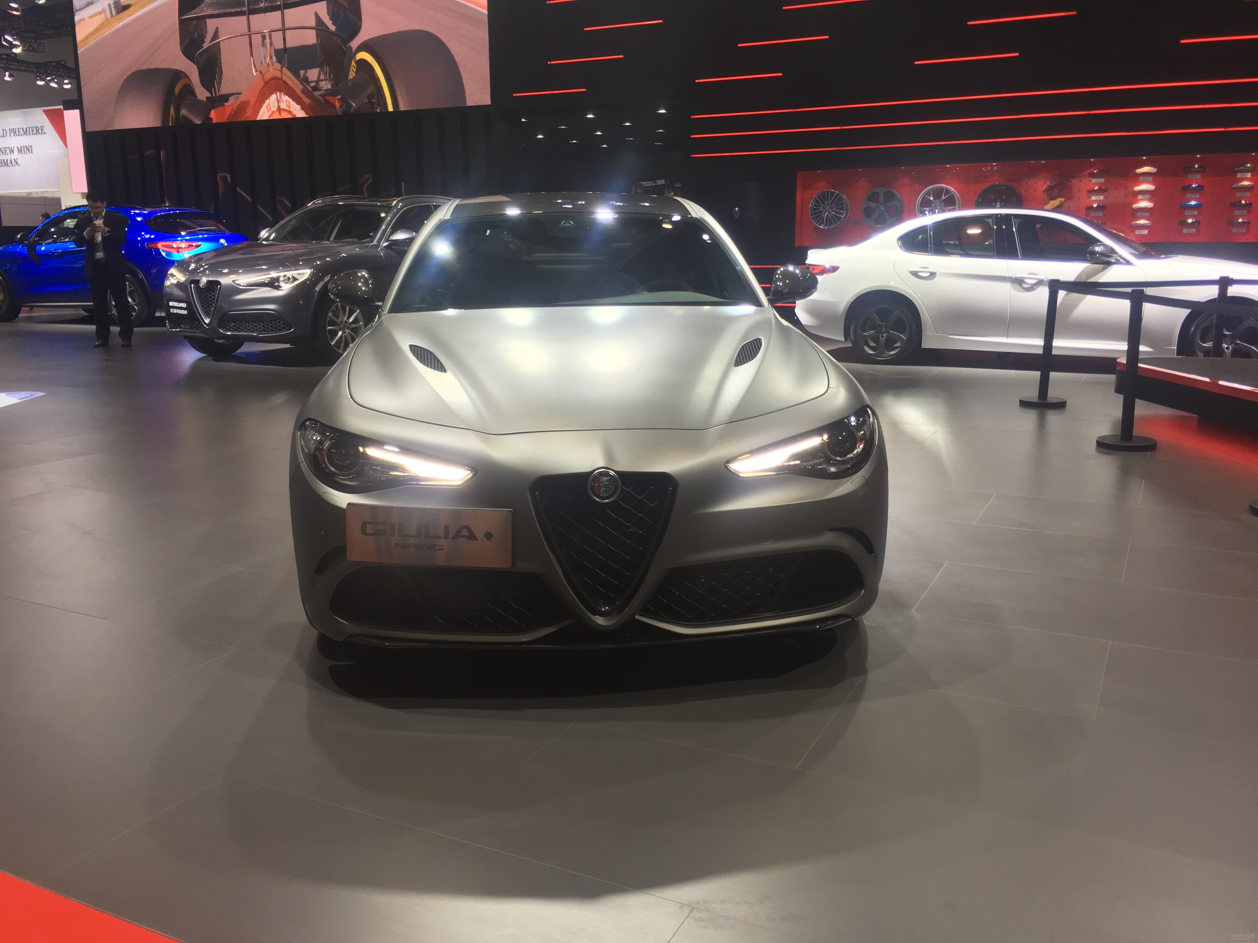 【尊流汽车网 上海车展】2019上海车展的阿尔法罗密欧展位上,展览了Giulia和Stelvio2款四叶草车系的纽博格林限定版本号车系,2款车系各限定108台。