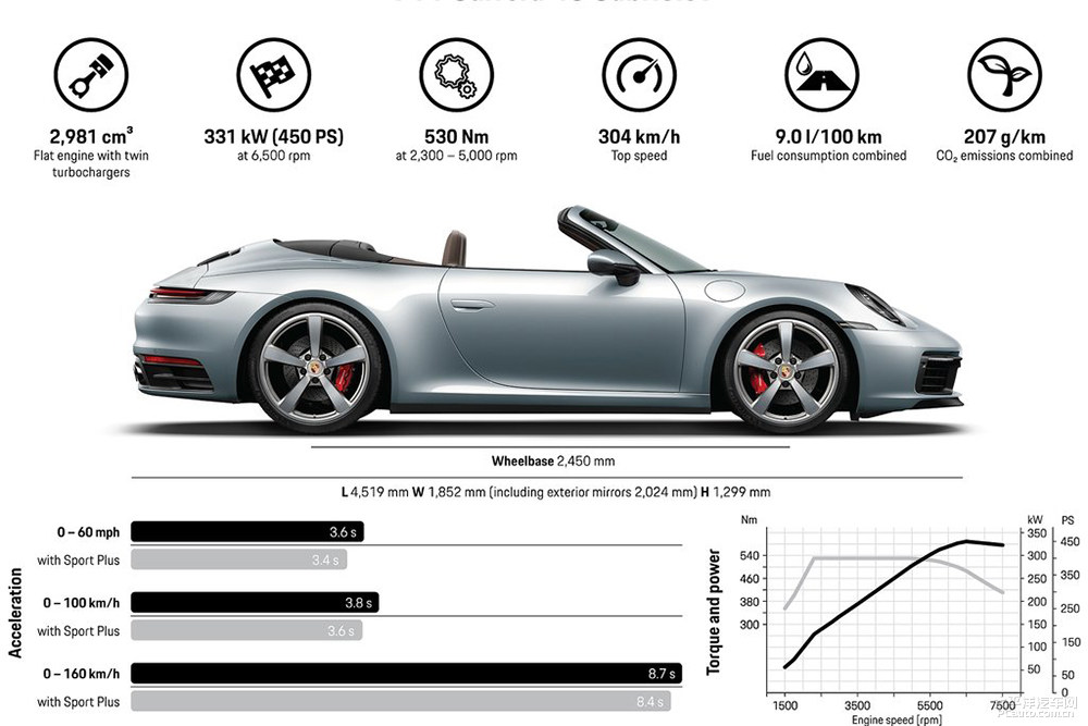新汽车配用3.0L水准对置六缸双涡轮增压模块,这副设备先前已运用在991版本号的Carrera/Carrera S/Carrera GTS上,但GTS的增压比此外二者更大。赶到992,Carrera S/4S Cabriolet换掉了这颗来源于991.2 GTS增压,相互配合更激进派的设置,至大功率赶到331kW(450PS),最高值扭距530N·m。比991时期的Carrera S/4S Cabriolet提高了22kW(30PS),配搭全新升级的8速PDK双离合变速箱,四驱版官方网0-100km/h加快3.8s(后驱版为3.9s),选用SC模块则为3.6s(后驱版3.7s)。