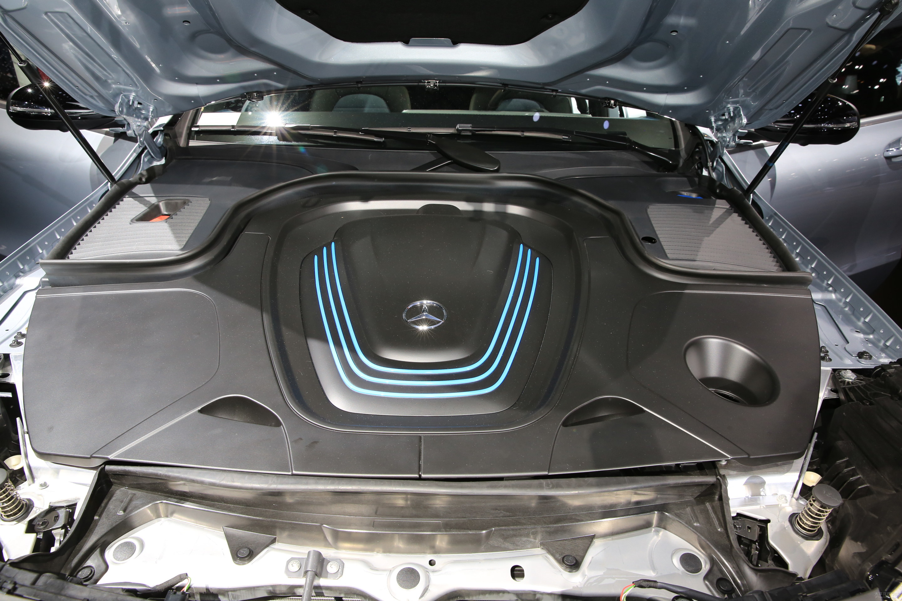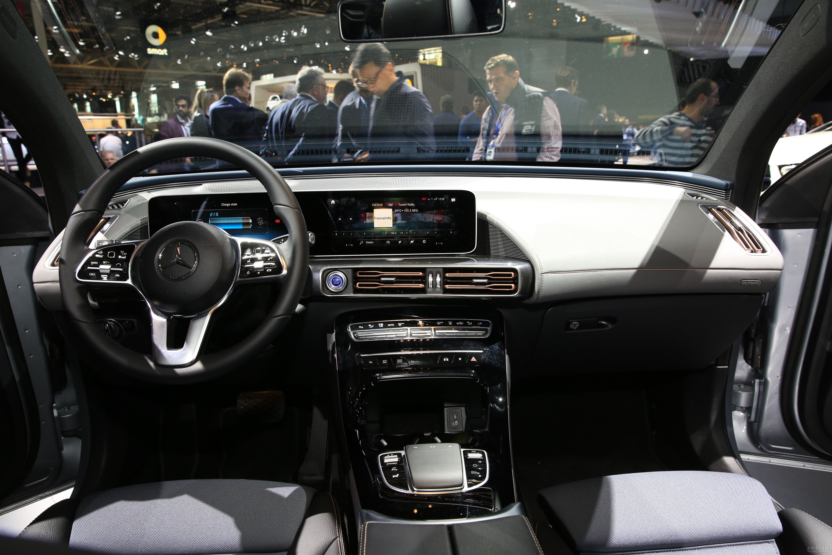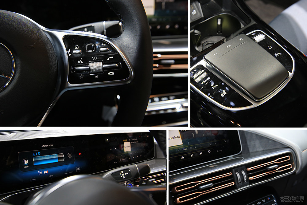 除此之外,此车有装配线了EQ系列产品车系专享的“线路板设计风格”的空调风口、紫蓝色的仪表盘背光、车内氛围灯和全新升级的三辐式汽车方向盘并有着双大拇指操纵(Dual Thumb Controls)系统软件,而中控台正下方的中央空调和多媒体系统物理学功能键区则持续了新款奔驰GLC室内设计风格。