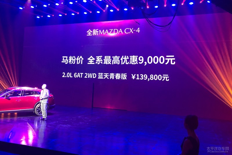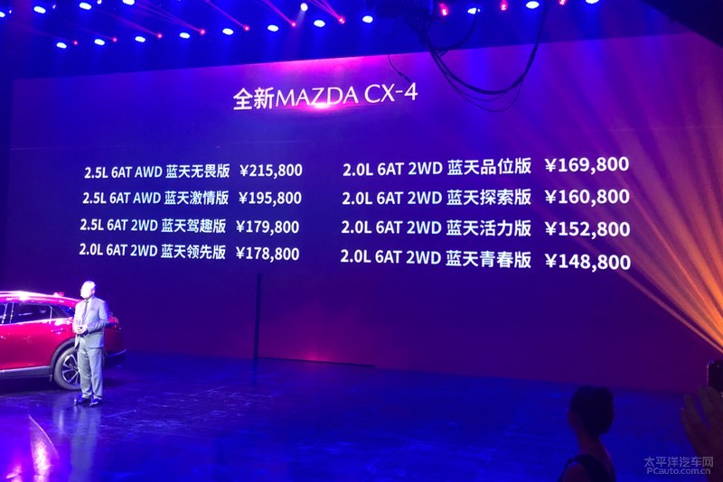 【尊流汽车网 新汽车频道栏目】11月8日,一汽马自达CX-4中后期换代车系将正式上市。新汽车最大的变化是前脸改装了全新的家族化设计语言,对比老款看起来更显炫酷。新款马自达CX-4有着2.0L和2.5L二种驱动力,并各自出示两驱和四驱可选。共发布8款车系,市场价区段为14.88-21.58万余元。特别注意的是,添加马粉同盟能够 享有马粉价全系列最大特惠9000元。