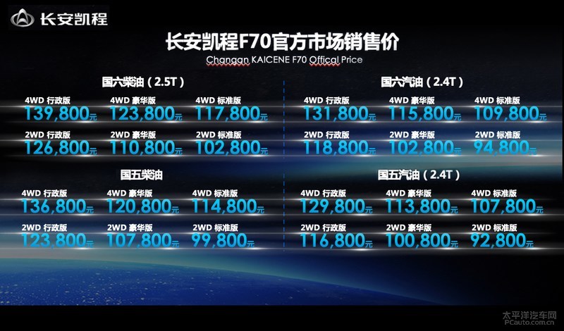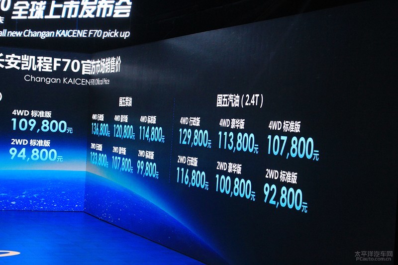【尊流汽车网 新汽车频道栏目】2019年10月28日,北京长安轻型车主打产品全新皮卡车系——北京长安凯程F70宣布发售。新汽车分国五和国六二种排污车系,各自推12款车系,其我国五车系又分1.9T柴油版、2.5T柴油版和2.5T车用汽油版,市场价区段为9.28-13.68万余元,国六车系分2.5T柴油版和2.4T车用汽油版,市场价区段为9.48-13.98万余元。
