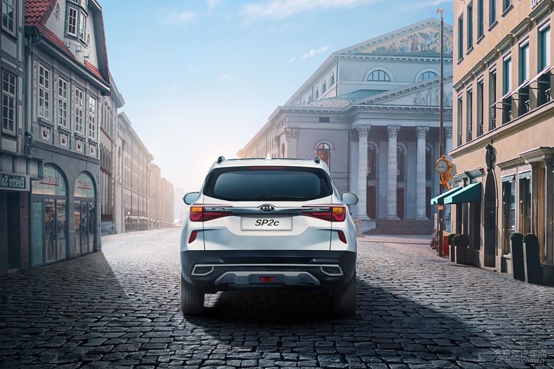 后尾一部分,起亚汽车Seltos的后尾灯组设计方案比较别具一格,横着的不锈钢装饰条与后尾灯相互连接,配搭正下方的不锈钢双出排气管及其大规模的银白色挡雨板,非常好地突显了此车SUV的粗犷气场。