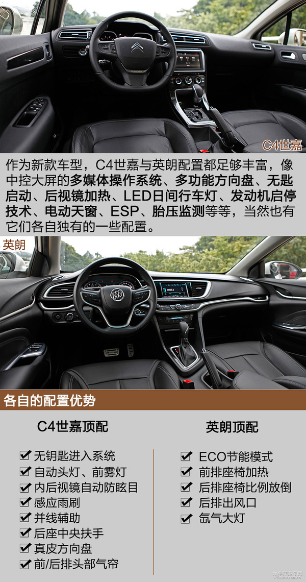 C4世嘉做为顶配车系,配备层面拥有显著的优点,像无匙进入系统软件、并线辅助、感应雨刷、内倒车镜全自动防眩目、前雾灯、自动头灯、后排座中央扶手、真皮方向盘、前/后排座头顶部气帘等,这种就算是英朗的最顶配车系都没有配置。自然,英朗的最顶配车系一样也是一部分好用配备是C4世嘉所缺乏的,比如ECO环保节能方式、前座座椅加热、后排座坐椅占比放平、后排座通风口、氙气灯。综合性来看,C4世嘉的配备更要丰富多彩些。