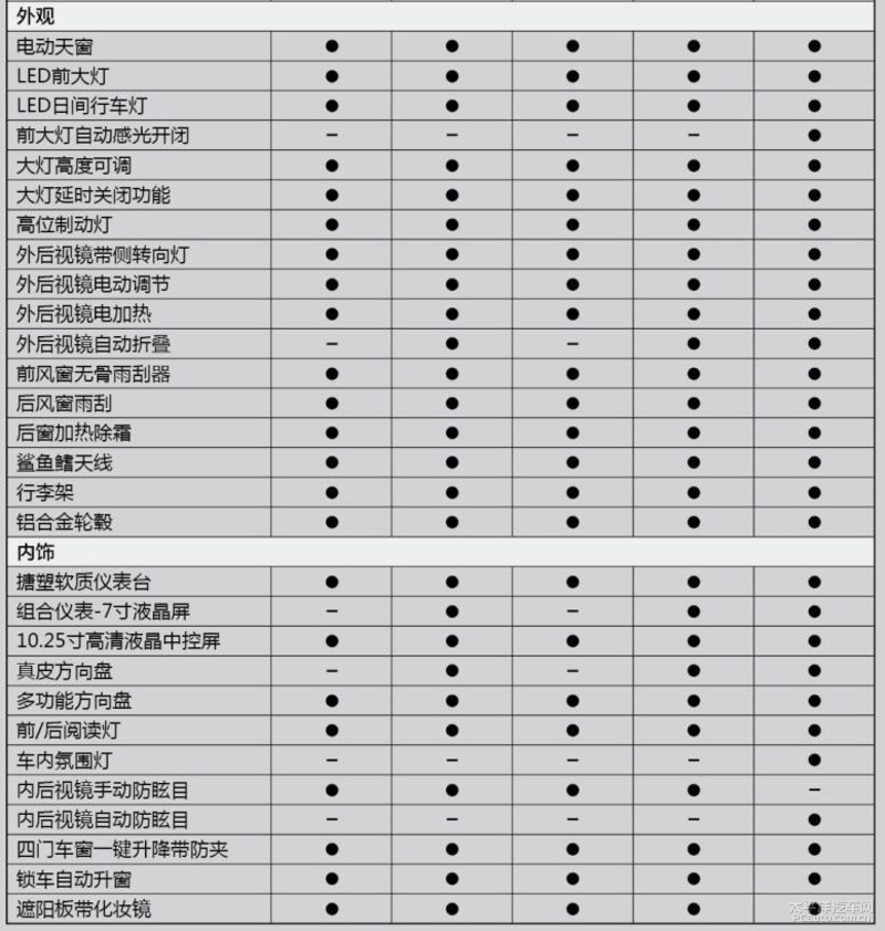 外界配备层面,自动天窗、LED车灯、大灯高度可调、外后视镜加热/电动式调整、车顶行李架均为标准配置。內部则标准配置了10.25英尺中控台屏、真皮运动方向盘、汽车真皮座椅、四门防夹夹层玻璃等作用。