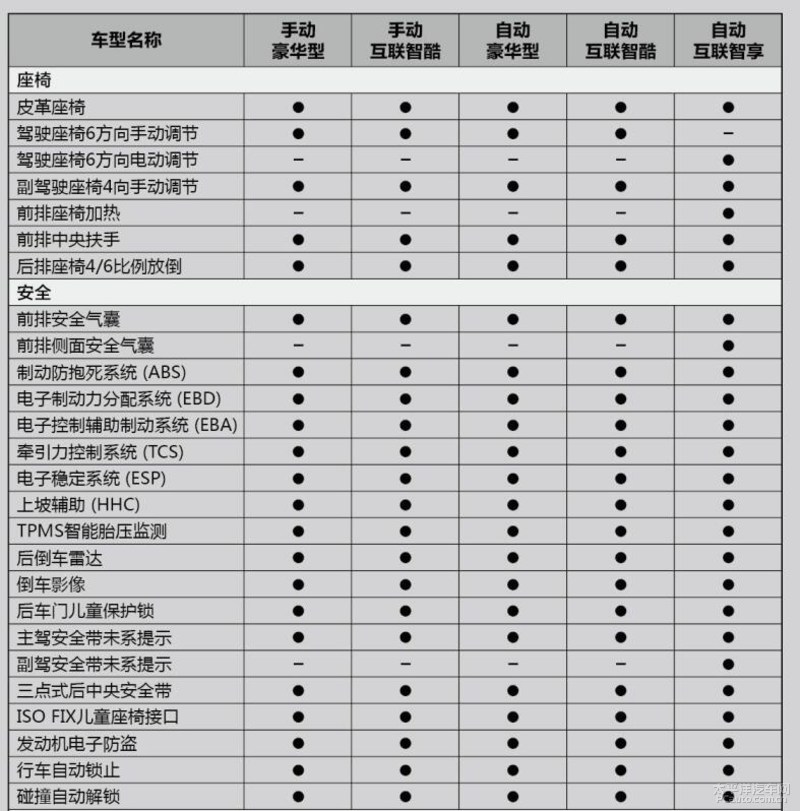 安全性配备层面,像牵引力控制系统软件、电子器件平稳系统软件、上坡辅助、胎压监测装置、后雷达探测、后倒车后视均为全系列标准配置。除此之外,也有安全驾驶輔助层面的巡航定速、电子驻车、无钥匙启动、手机蓝牙电話、车机互联这些均为全系列标准配置的作用。
