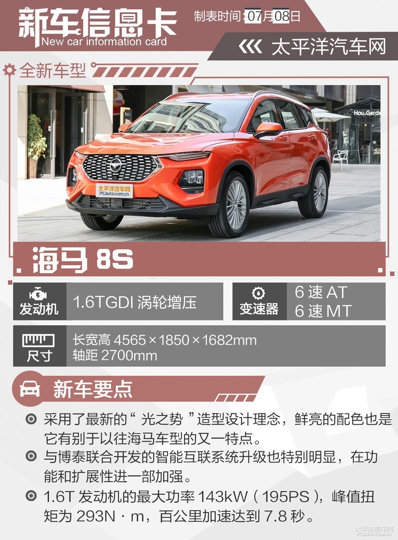 【尊流汽车网 新汽车频道栏目】7月8日,海马汽车全新SUV车系8S将宣布发售,此车是海马汽车的全新旗舰级SUV,根据HMGA模块化设计服务平台开发设计打造出,配搭一台1.6TGDI柴油发动机。福美来8S在7月刚开始市场销售,共发布6款车系,价钱区段为7.99-12.59万余元。