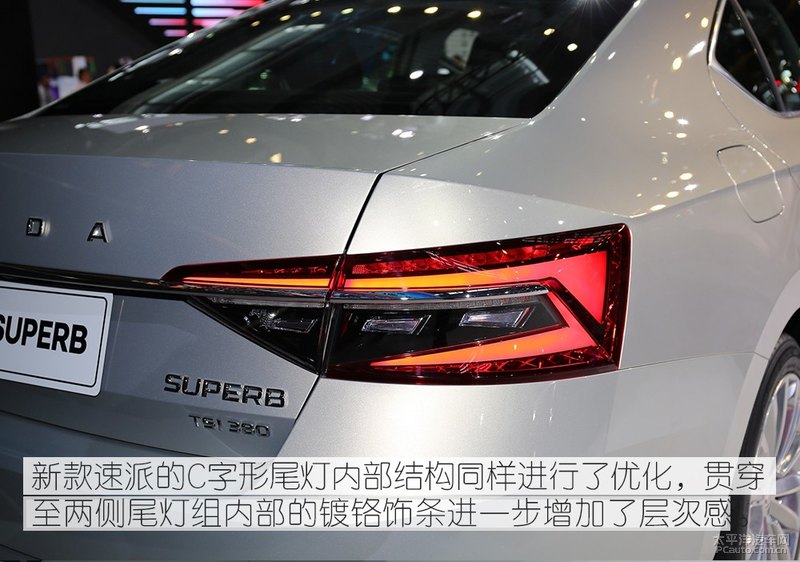 最新款速派的后尾与该款基本相同,代表性的C形后尾灯足以保存,并由一条围绕式不锈钢条相接,提升质感,但是后尾灯内部构造有一定的转变,与头灯相映衬。值得一提的是,最新款速派的尾端撤销了斯柯达LOGO,取代它的的是“ŠKODA”英文字母标志,这都是斯柯达的全新设计构思。