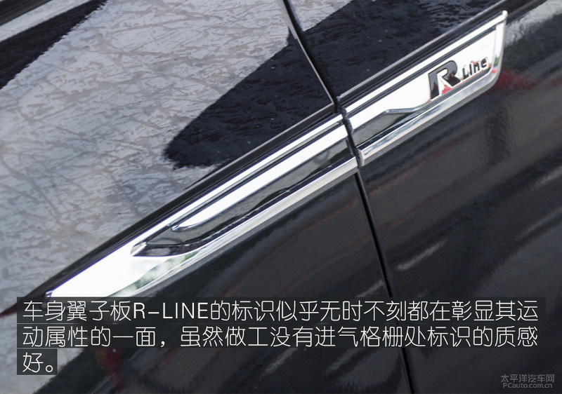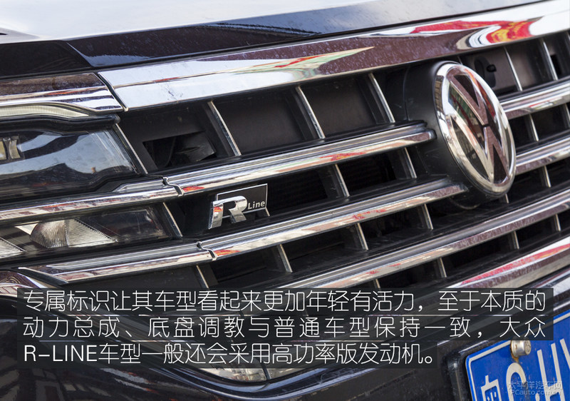 高矮配车系的进气格栅有一定的差别,顶配车系应用R-LINE模块,两边粗大的真引流口进一步优化了流体力学主要表现,总体霸气侧漏许多。