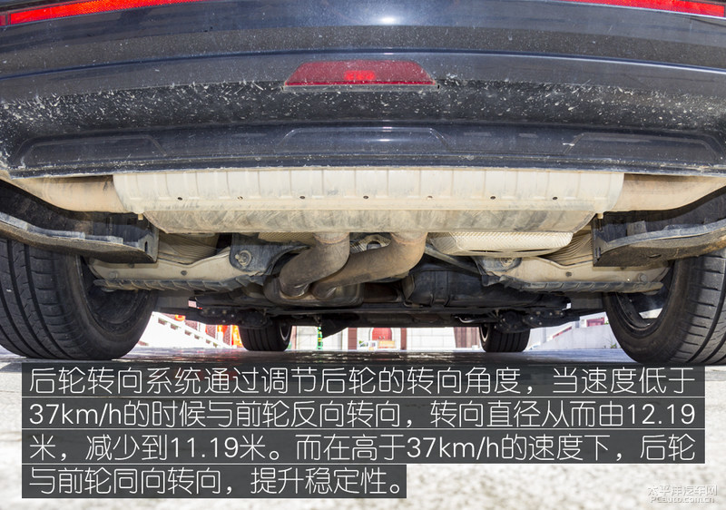 全轮汽车转向系统促使途锐的协调能力及可靠性获得了全面提高。在低速档转为时,后胎将全自动与前胎反方向转为,以降低最小转弯半径;当汽车行使时,后胎将全自动与前胎同方向转为,变更车道将更为轻轻松松、平稳。