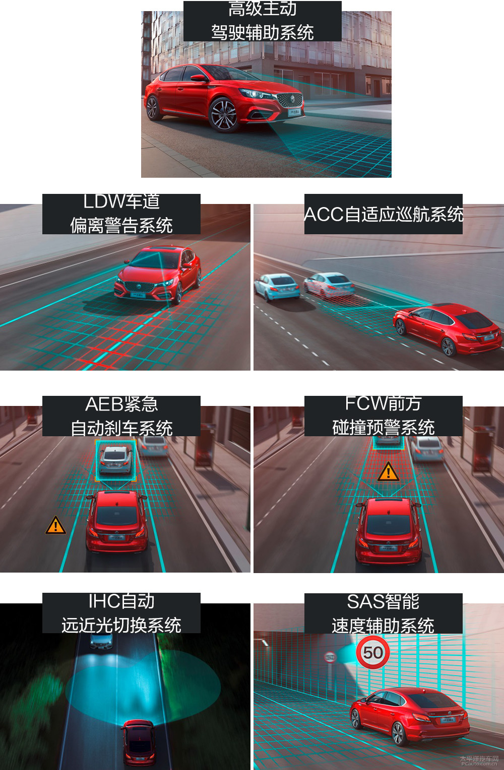 新款车型配用ACC自动巡航、AEB应急自动刹车系统软件、FCW正前方撞击预警信息、LDW行车道偏移警示系统软件、SAS智能化速率輔助系统软件、IHC全自动近远光转换为一体的MG Pilot(ADAS)高級积极安全驾驶輔助系统软件,并加配内后视镜全自动防眩目、全方位超清全景影像和降雨量磁感应无骨雨刮器系统软件。