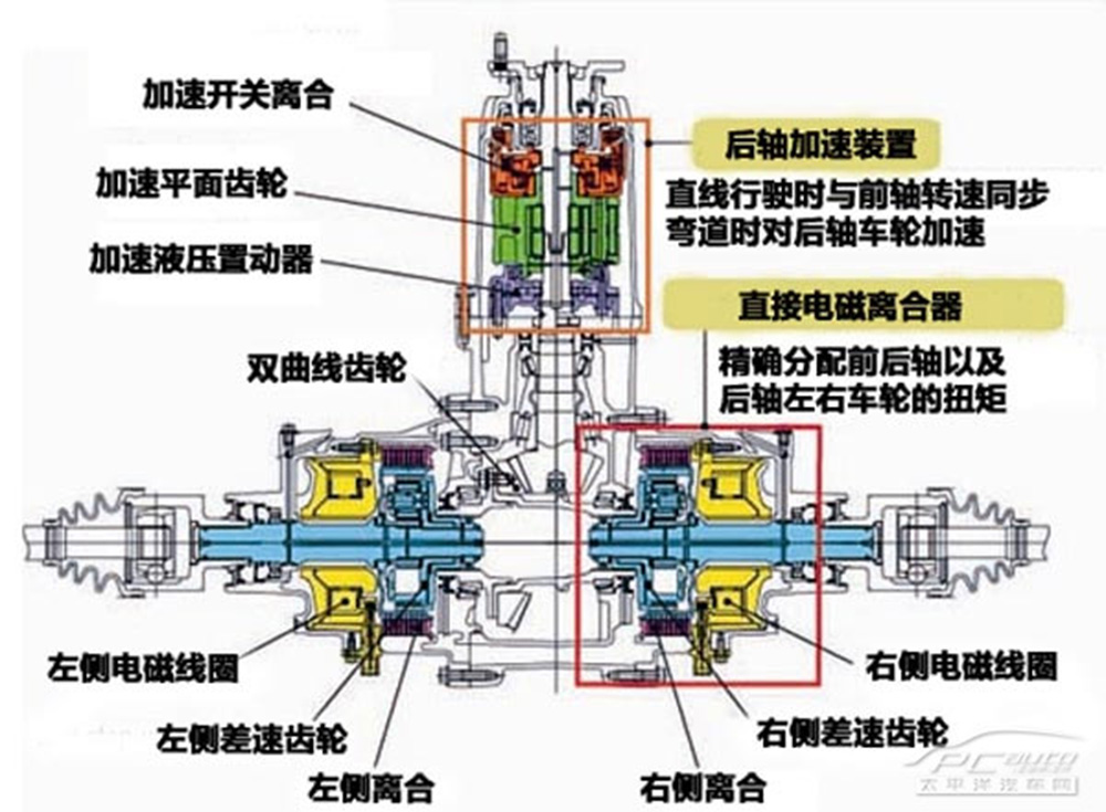 2个电磁制动器的功效:根据对这种离合的操纵,可更改前、后扭矩分派。依据不一样状况,后胎能获得模块总輸出的30%到70%,上下两边的立即电磁制动器还可以独立操纵,極限状况下可将汽车后桥的所有扭矩分派到一个车轮子上面。
