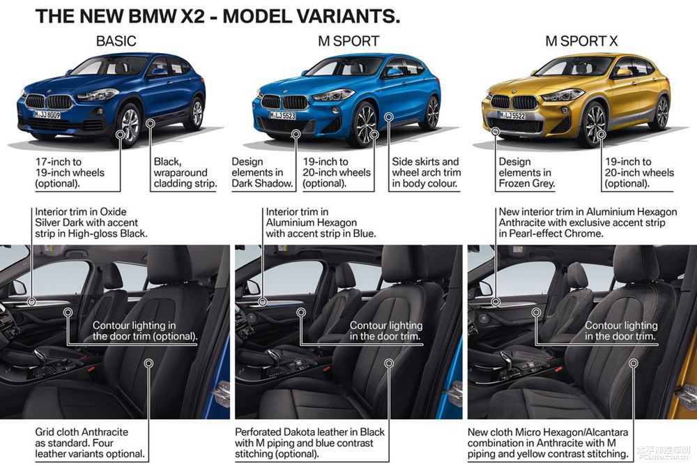 宝马五系X2与宝马X1共享资源汽车动力系统,发布包含1.5T(三缸X2 sDrive18i)和2.0T(四缸X2 xDrive20i)以内的几款驱动力,传动装置配对7速Steptronic变速器。做为注重安全驾驶快乐的知名品牌,其一样为新汽车出示了COMFORT、ECO PRO及其SPORT这三种方式可供转换。