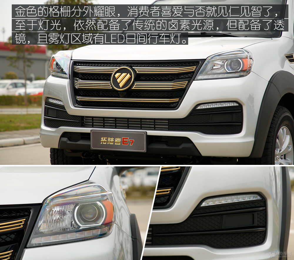 拓陆者E7在发售前不曾对外开放表露出有关新汽车的一切信息内容,小编也是来到新品发布会当场才足以看到“庐山真面目”,新鲜感十足。新汽车转变最显著的是前脸,不但选用了运动感更强的条幅式格珊,还未格珊造型设计开展了金黄喷涂,下格珊更选用了连接式设计方案,且左右两端的LED日行灯替代了传统式的前雾灯。单看前脸,实际上与普遍的SUV无有,相对性普遍的商业皮卡车,空出了一份精美感。