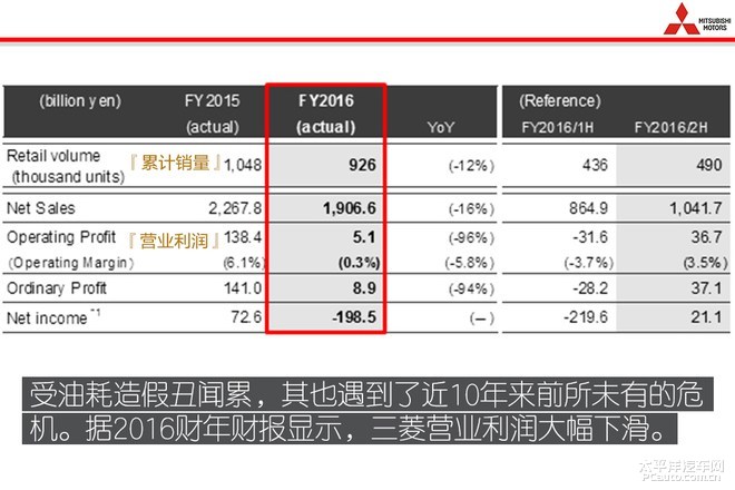 另外受耗油量作假丑事累,其也碰到了近十年来史无前例的危機。据2016财政年度财务报告显示信息,三菱汽车企业的利润总额大幅度下降,从而前的1384万美元降低至51万美元,亏损1985万美元,全世界销售量降低12%。更始料不及的是除欧美地区外,其他销售市场的销售量均在下降。