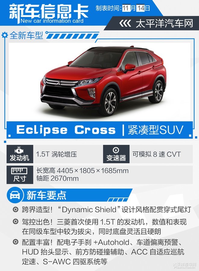 三菱Eclipse Cross概述历经四年的产品研发成效,设计方案是最可以立即触动人的因素,Eclipse Cross的身上分毫看不见三菱之前传统的室内设计风格,巧借车名而扭转局势之中发布的商品彻底是新型游戏玩法。