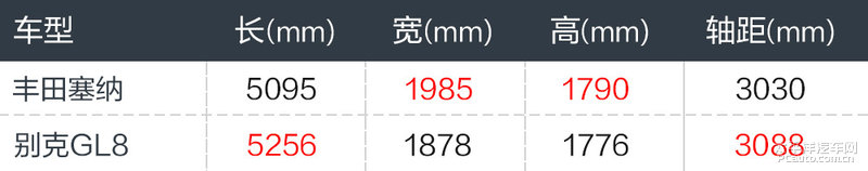 塞纳给人觉得是一台规格很大的车系,殊不知事实上塞纳的车体长短只能509毫米,要比新款gl8短些。可是在车体总宽层面塞纳则做到了198毫米,比GL8要宽了许多 ,因而看上去会更显空气。而轮距层面,塞纳也超出了3米,做到了3030mm。