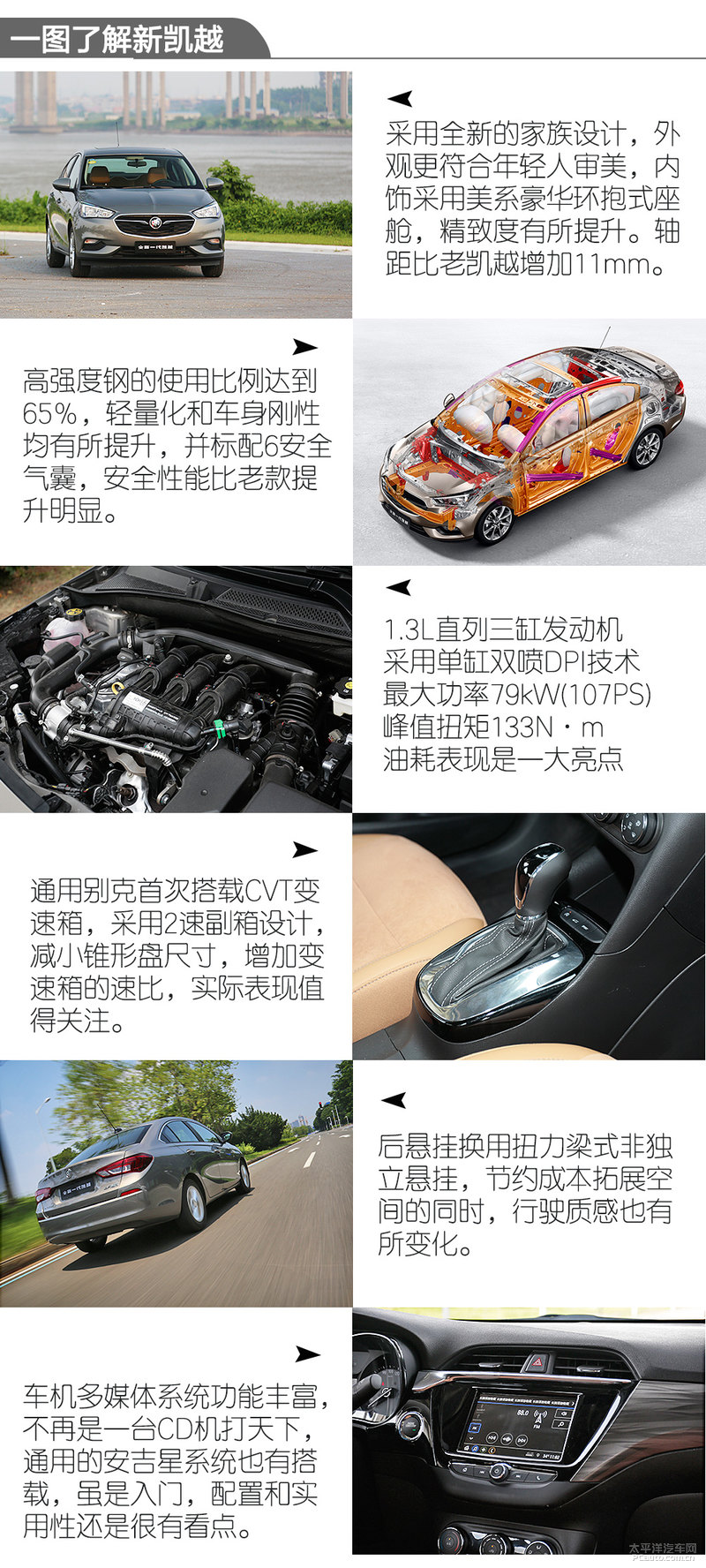 老凯越在停工以后也随着沉静下来,但是新凯越的来临确实令人眼前一亮,众多转变令人不可以将新老交替几代车系放到一起较为。新的大家族设计方案更年青时尚潮流,1.3L自吸三缸发动机称之为是主流产品增压三缸机全球的一股清流,而通用别克初次配用CVT变速器也变成一大话题。体重下降、轮距提高、配备转变,众多不一样让新凯越无时无刻不在阐释自身的“新”。