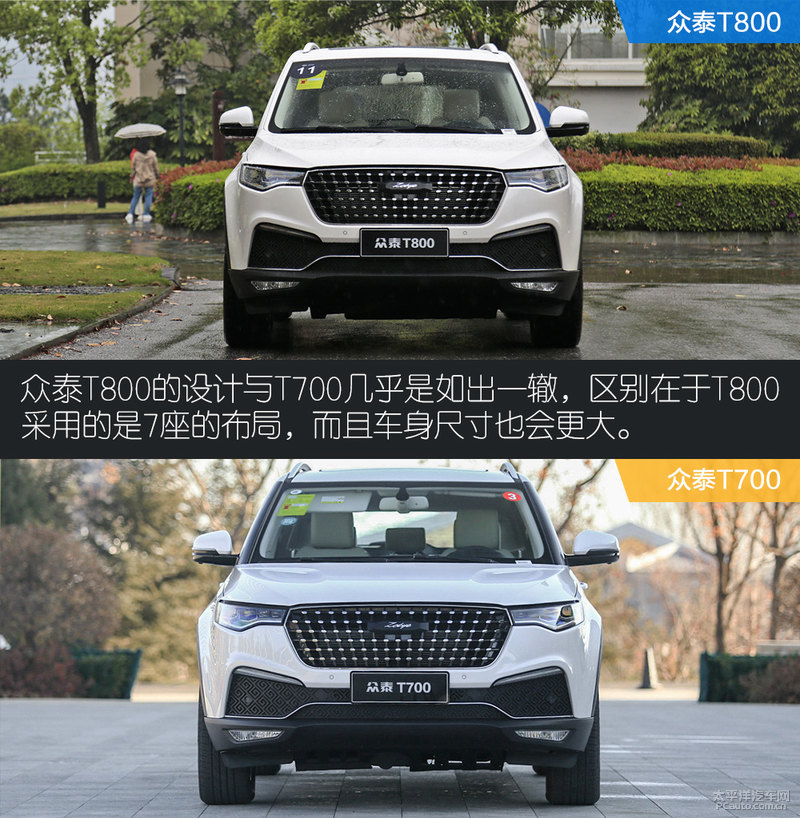外型层面,众泰T800的设计方案与以前的T700基本上是一致的,可是规格有一定的扩大,这类外型基本上同样,但规格不一样的招数在自有品牌中也许多 见,例如传祺的GS7和GS8,及其长城哈佛H7和H7L等。