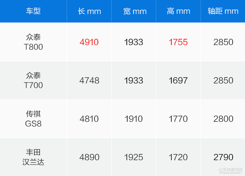 不但比T700变大一圈,即便与传祺GS8和汉兰达对比,T800的规格依然拥有 优点。