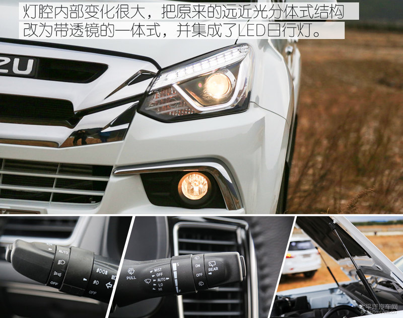 车灯內部的发生变化,除开集成化LED日行灯之外,还把原先的近远光分离式构造改成带镜片的一体式,但里面還是维持卤素灯泡灯源不会改变。此外,2018款mu-X提升了自动大灯及其全自动雨刮器,并且汽车引擎盖也提升了液压机支撑架。配备水准终于紧跟了二十万元的水准了。