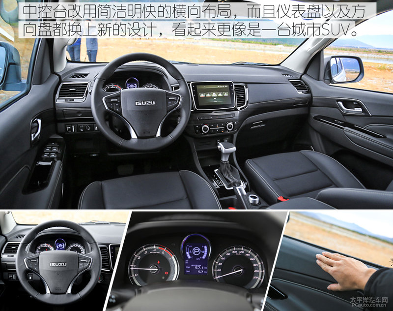 比较之下,我觉得2018款mu-X车内饰的转变会更吸引人一些。之前人们会感觉mu-X的车内饰還是有点儿工程车那类粗狂设计风格,用起來一切正常,但层次感就算不上了。而如今仪表台改成简约轻快的横着合理布局,车内仪表盘及其汽车方向盘都换掉新的设计方案,看上去更像一台大城市SUV。并且仪表台及其门边框上沿部位早已改成搪塑材料遮盖,摸起来触感更强些。