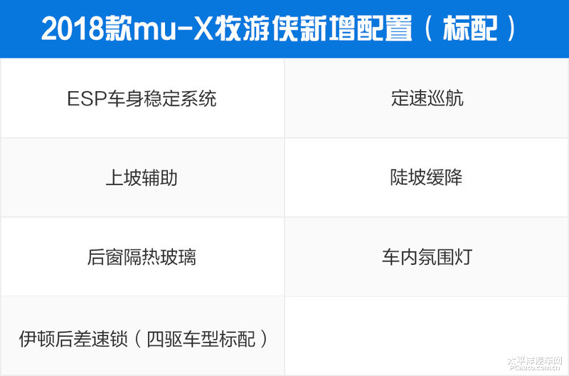 不值一提的更改还包含前后排的坐椅。旧款mu-X买车人对坐椅难受的埋怨生产厂家听到了。因此2018款mu-X坐椅的侧面及其肩膀支撑点显著有一定的提高,并且连在手动式腹部支撑点调整及其副驾电动式调整也是新款汽车私有的工资待遇。