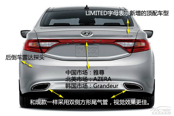【尊流汽车网 新汽车频道栏目】2014款现代雅尊(AZERA)在北美地区发布全新换代车系,在美起市场价为31000美金,约18.7万RMB,比该款下降了1250美金(约7594元RMB)。并增加一款名叫Limited的旗舰级车系,此车型市场价为34750美元,折合21万RMB,关键提升LCD车内仪表盘、8英寸网站导航、电动式伸缩倒车镜和座椅通风加温系统软件。