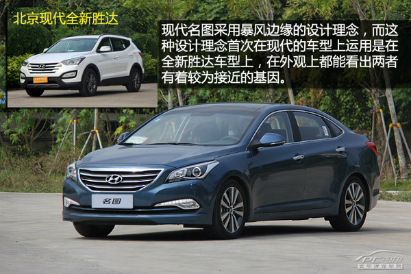 而北京市现代名图并沒有和索纳塔八一样选用流体力学雕塑设计,只是应用到了当代全新的造型设计定义“风暴边沿”,这一设计构思最先在新胜达(Santa Fe)上应用,接着在最新款ix35及其当代几款大家族车系上由此可见。现如今也是应用在名图之中,变成名图一大产品卖点。