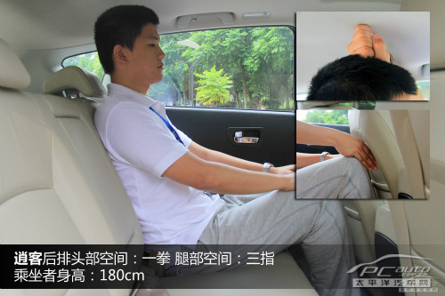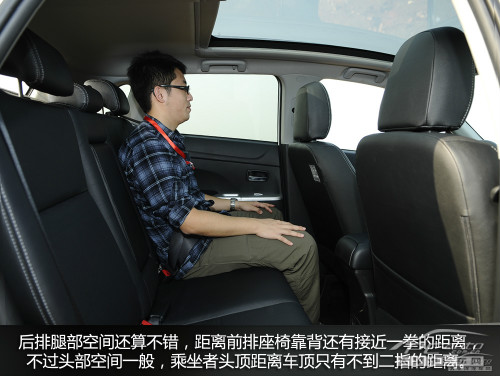 图中是广汽三菱劲炫ASX的后排座室内空间,从图由此可见,脚部室内空间也算是非常好,腿间距前座坐椅椅背也有贴近一拳的间距,但是头顶部室内空间一般,乘座者头上间距车子顶部只能不上二指的间距。