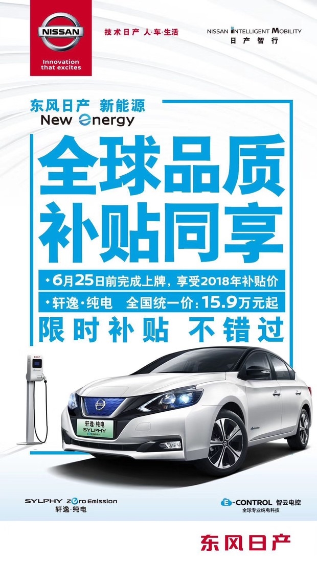 【尊流汽车网 制造行业频道栏目】3月26,國家公布了今年新能源车补贴现行政策,最新政策将导致补助信用额度大幅度退坡。因此,东风日产对于主打产品车系轩逸·纯电发布保价现行政策:要是在6月25日以前进行上车牌,就可以享有2018的足额补助。