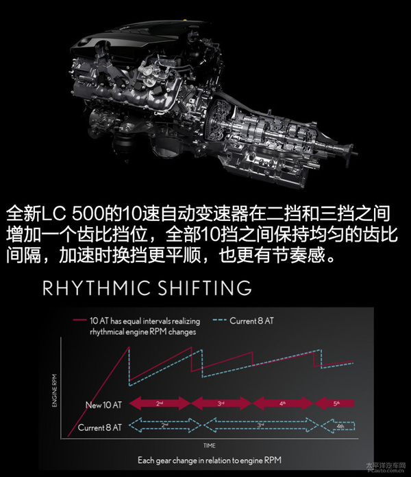 在LC500上边,配用了全新升级开发设计的10AT变速器。而每每提到这一10AT变速器的特点,技术工程师们都会最先抬起左手,用大拇指和中拇指打着了节奏感间距平等的六声指响“啪啪啪啪啪啪”。怎解?这六声节奏感同样的指响,意味着着全油门踏板发展下,这变速器前六档的换档间距全是一样的。这代表不仅等产生更强的平稳性和换档节奏性,柴油发动机和排汽管的引擎声节奏感也更悦耳,更有安全驾驶快乐。