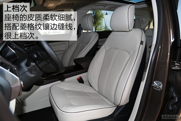 此外,坐椅也选用了更绵软更有层次感的高級牛皮,另外选用豪华轿车上普遍的菱格子图案嵌边缝合线,级别感显著提高。