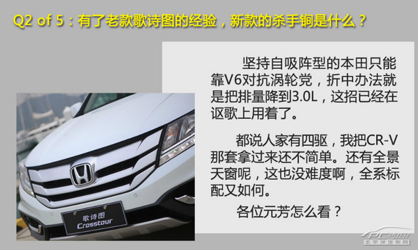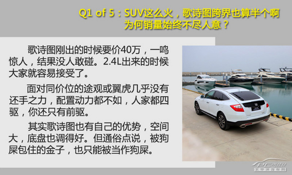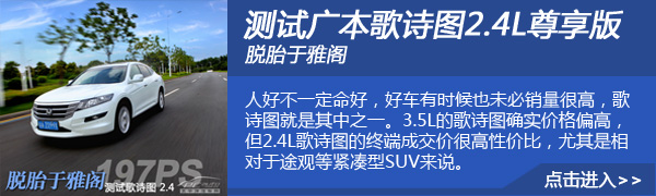 【尊流汽车网 测评频道栏目】SUV早已红透半边天了,但广本到现在还一台也没有,同胞们的CR-V在圣坛上面替你心急了。在SUV版飞度发售以前,跨界营销的歌诗图也算半辆SUV吧,并且发售即斩获广州本田在华较贵车系头衔,发烧级的工资待遇啊。但它的销售业绩好像还学不上CR-V的一些之一。历经漫长的审核期,2014款歌诗图重振旗鼓,将要再战江湖,这次便是有备而来的了。