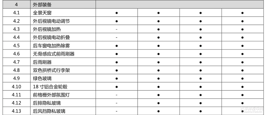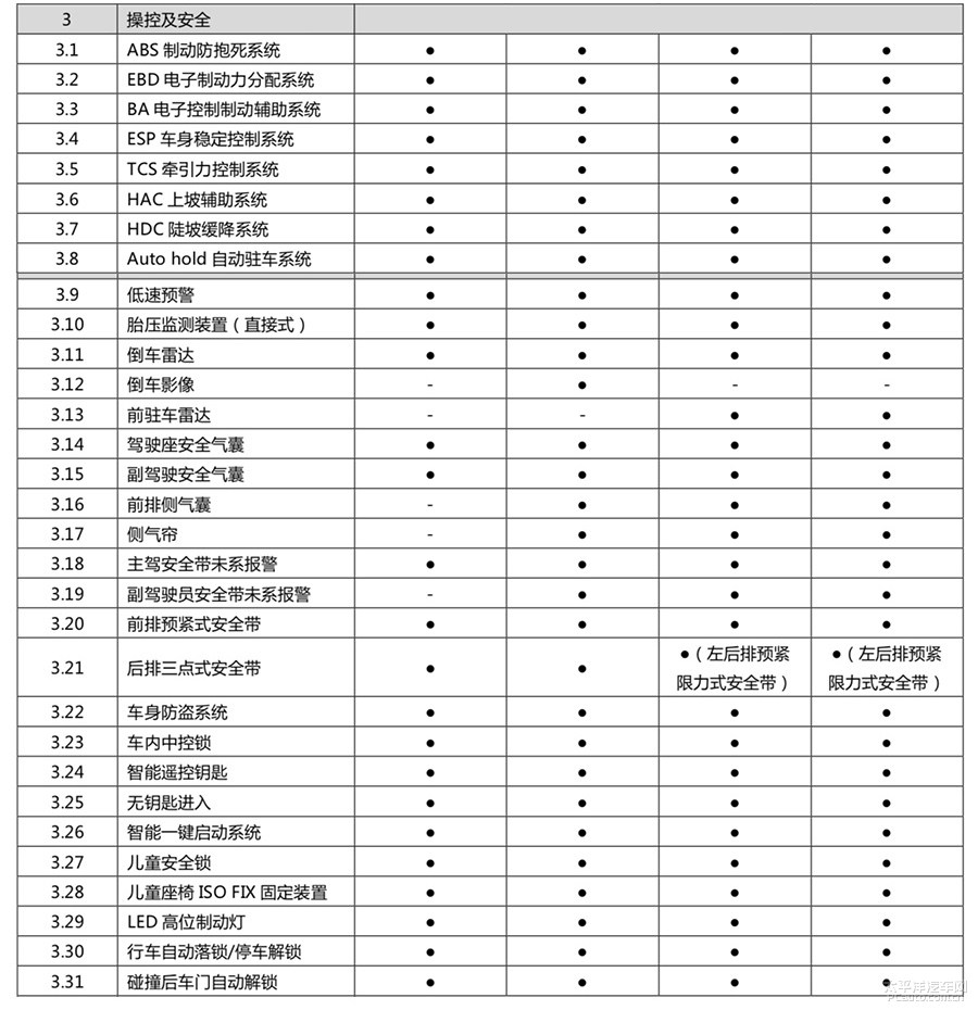 EX5全系列标准配置18英寸铝轮毂、LED大灯、全景天窗车、车灯全自动磁感应作用。值得一提的是,新汽车仅有最少配的悦风版缺少了外后视镜加热、电动式伸缩、外界车内氛围灯、后排座/后风档隐私玻璃的配备,而顶配车系有着前驻车雷达、前座侧气襄及侧气帘。