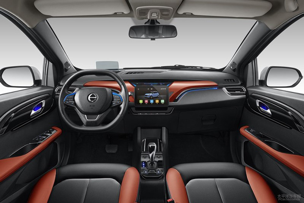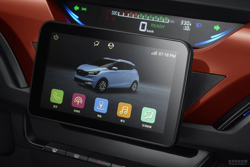 新汽车内装一部分选用了黑白红色系搭配,并在关键点处添加深蓝色原素以突显新纯电动汽车真实身份。仪表台设定了二块显示屏:升降式的8英寸触碰中控台液晶显示屏和侧后方的大数字组合仪表,在其中大数字组合仪表能显示信息电池容量、时速、工作电压、电流量等车辆采集的信息。