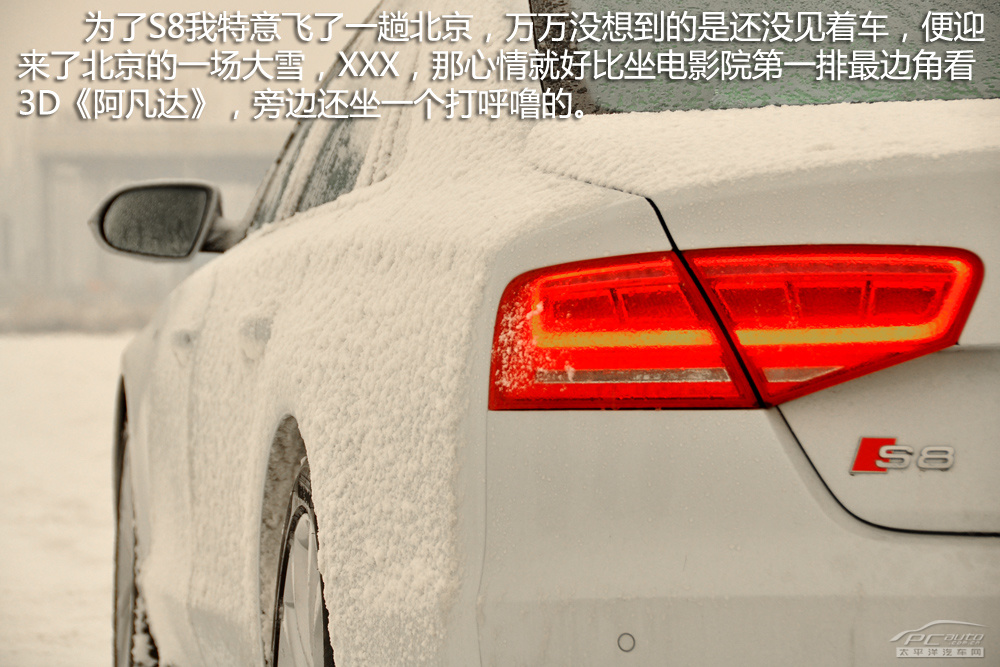 因此我刻意飞一趟北京市,万万想不到的是还没有见着车,便迈入了北京市的一场大雪,XXX,那情绪就如同坐影院第一排最边缘看三d《阿凡达》,周围还坐一个睡觉打呼噜的。大雪纷飞花的早晨@刘石磊PCauto开了乳白色S8花了4个钟头走在路上才接好我,随后大家再堵了一个多钟头才到检测场所。一切正常的测试报告是彻底无法干了,只有改成我来这一沒有过多风雪工作经验的中国南方网编,来跟大伙儿聊一聊一些雪天行车的体会吧。