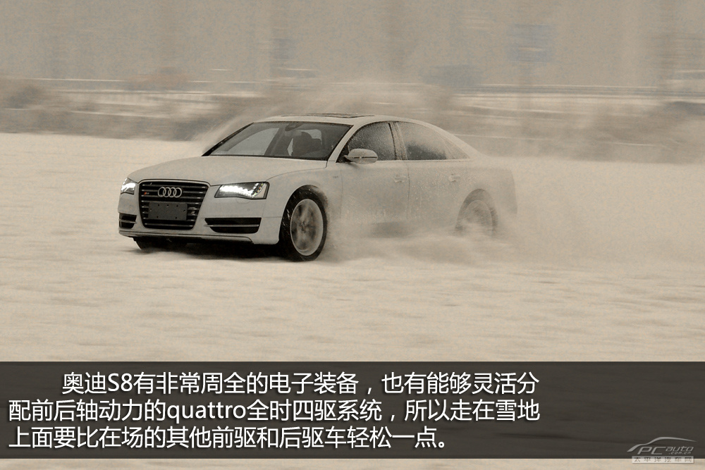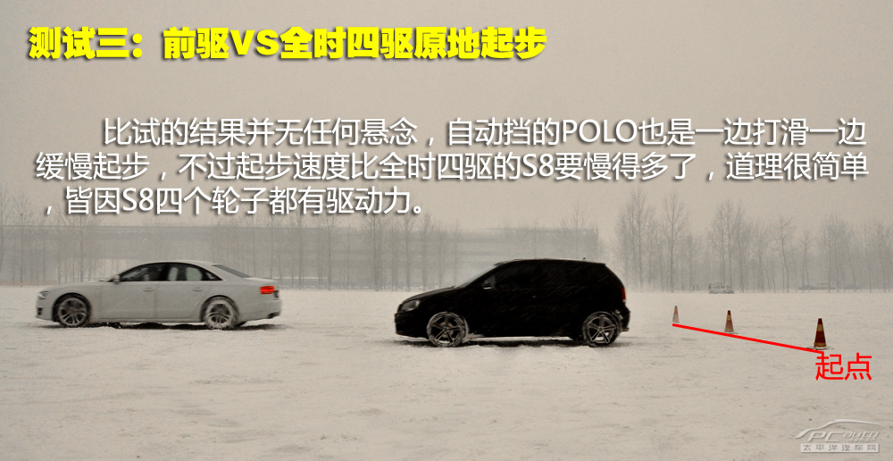 较量的結果并无一切伏笔,自动档汽车的POLO也是一边跑偏一边迟缓发展,但是发展速率比全时四驱的S8要慢得多了,大道理非常简单,皆因S8四个车轮子都是有推动力,就算这推动力很比较有限,并且基础由路面情况来决策,但远比两驱的POLO要好。这一检测也一定水平上表明了全时四驱针对雪天驾驶還是有协助的。