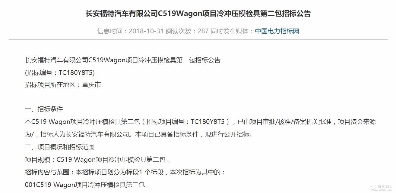 【尊流汽车网 新汽车频道栏目】大家从我国电力招标网中获知,长安福特开展了一项编号为C519Wagon新项目冷冲压模具检具招投标。而福特汽车新一代福克斯旅行版的编号恰好为C519Wagon,可以看出,新一代福克斯旅行版将迈入国内。