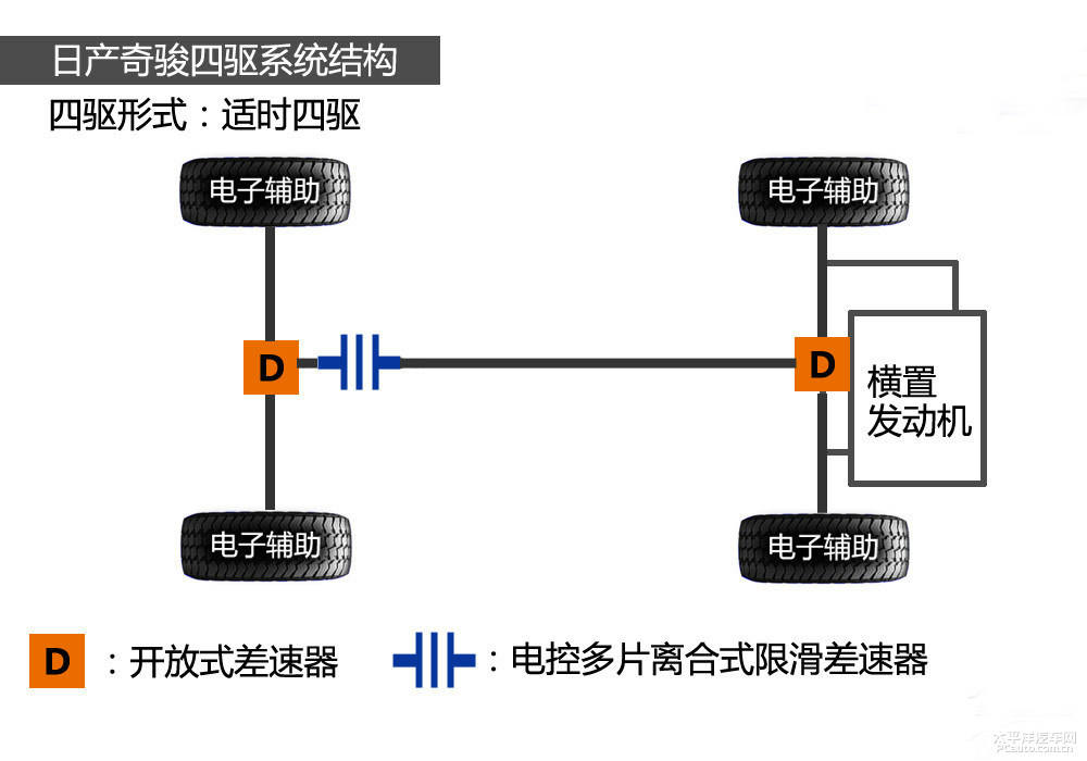 日产奇骏选用的是一套多片离合器式的智能化全方式四驱系统,也就是大家常说的适时四驱,它具备2WD(两驱方式)、Auto(全自动方式)、LOCK(四驱锁档方式)三种方式。其关键部件是一套由电磁感应操纵的多片离合器式的中央差速器,即根据释放压力和卡紧来分派前后左右轴的驱动力。前后左右轴均为敞开式分动箱,并含有电子器件輔助制动系统作用。
