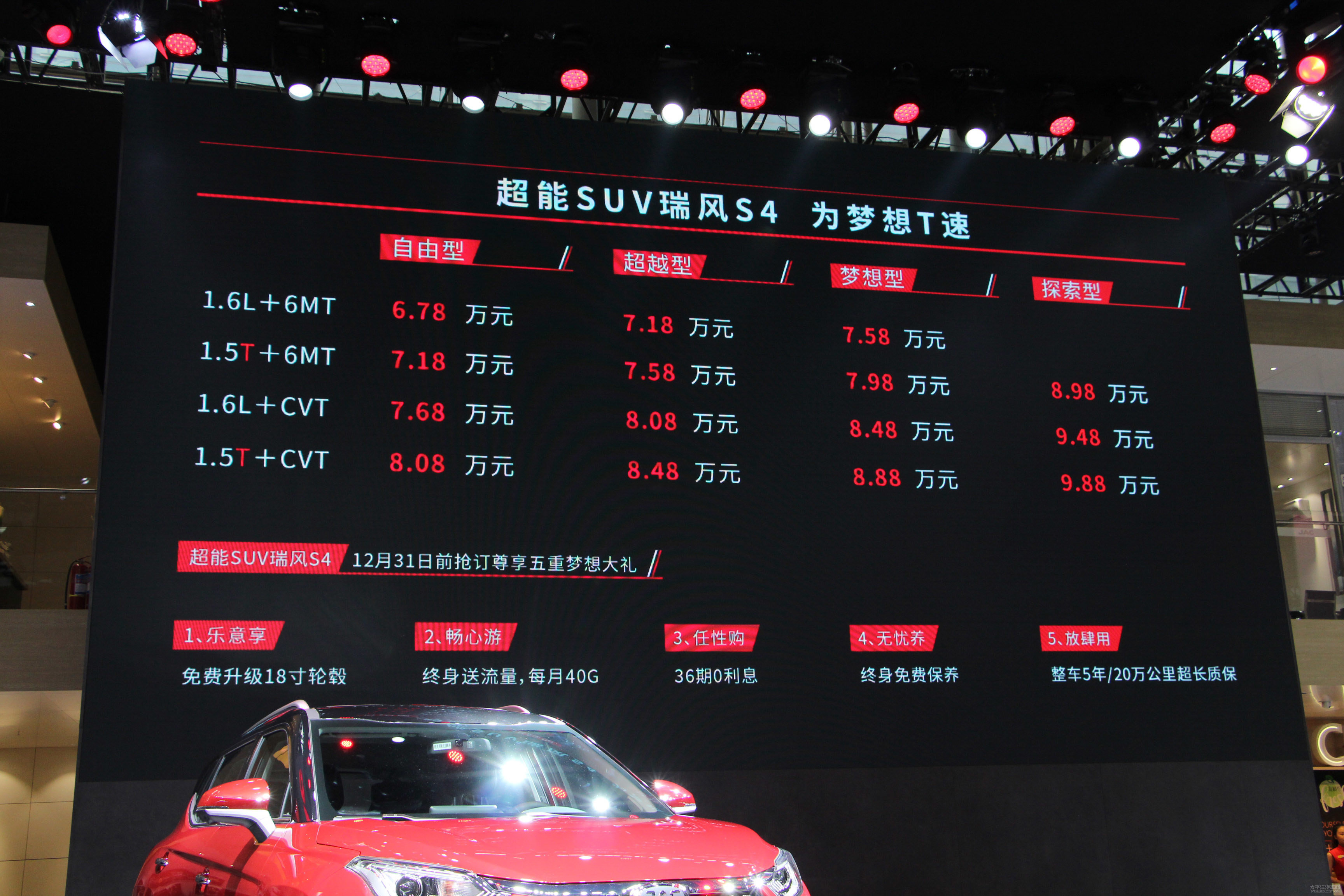 【尊流汽车网 2018广州国际车展】11月16日,江准主打产品全新升级中小型SUV瑞风S4正式上市,市场价区段为6.78-9.88万余元。此车外型和车内饰一部分在传统式瑞风的基本上干了一部分改动,配用1.5T涡轮增压器和1.6L自吸2款柴油发动机。